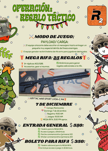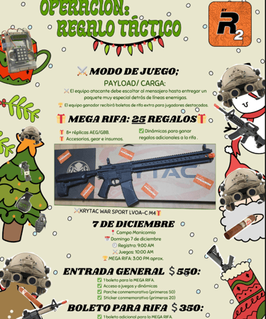 Operacion: Regalo tactico el equipo atacante debe ascoltar al mensajero hazta enbtregar un paquete muy especial detas de lineas enemigas en el campo manicomio, Tijuana
